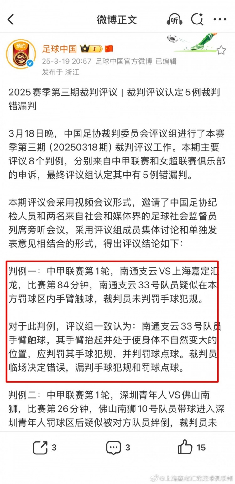上海嘉定汇龙官方写道:本赛季中甲联赛截止上轮,经中国足协裁委会评议组认定,共三次漏判给上海嘉定汇龙点球。