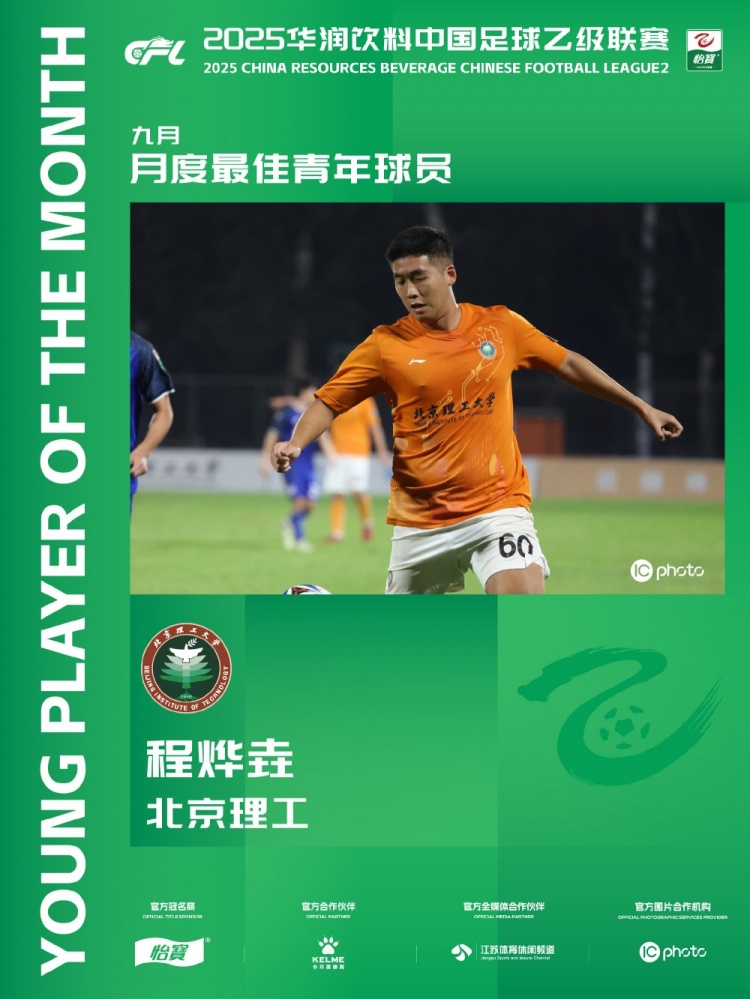 10月31日讯 中乙联赛官方公布了9月最佳青年球员,北京理工球员程烨垚当选,他在9月出场4次打入3球并送出2次助攻。