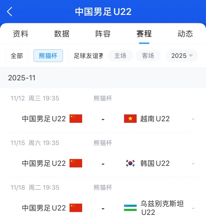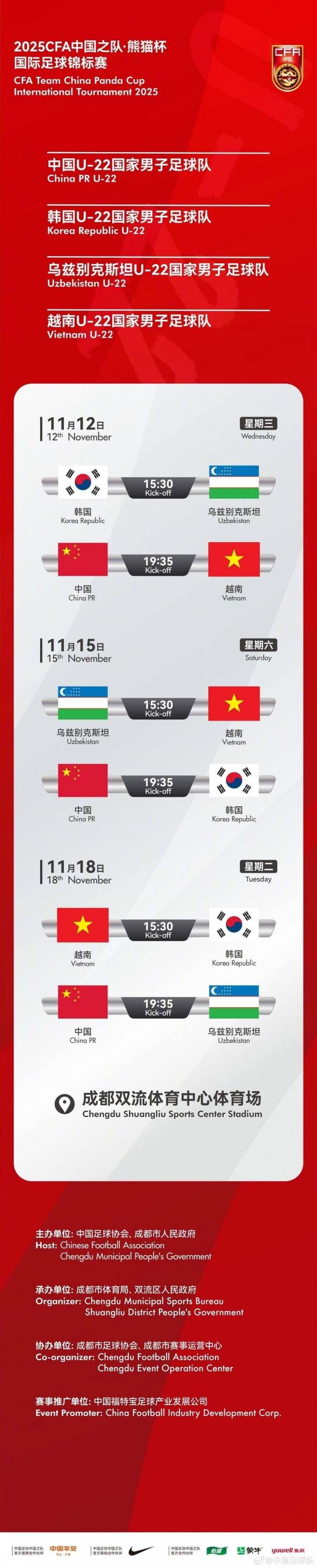 为备战2026年U23亚洲杯及名古屋亚运会,经队伍教练组研究、中国足球协会批准,中国U-22国家男子足球队定于2025年11月9日至19日赴四川省成都市组织集训并参加熊猫杯国际足球锦标赛。