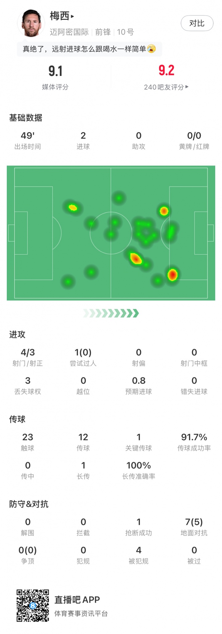 梅西半场数据:上演梅开二度!7次对抗5次成功,4次被犯规
