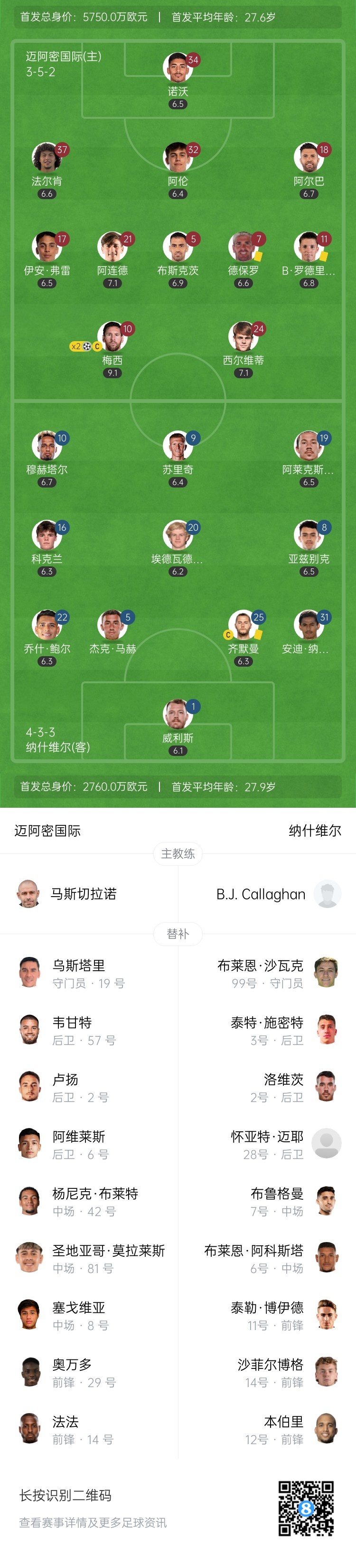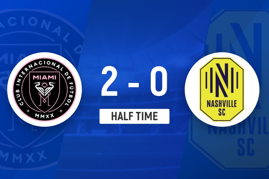 半场-迈阿密国际暂2-0纳什维尔 梅西弧顶位置梅开二度生涯已894球