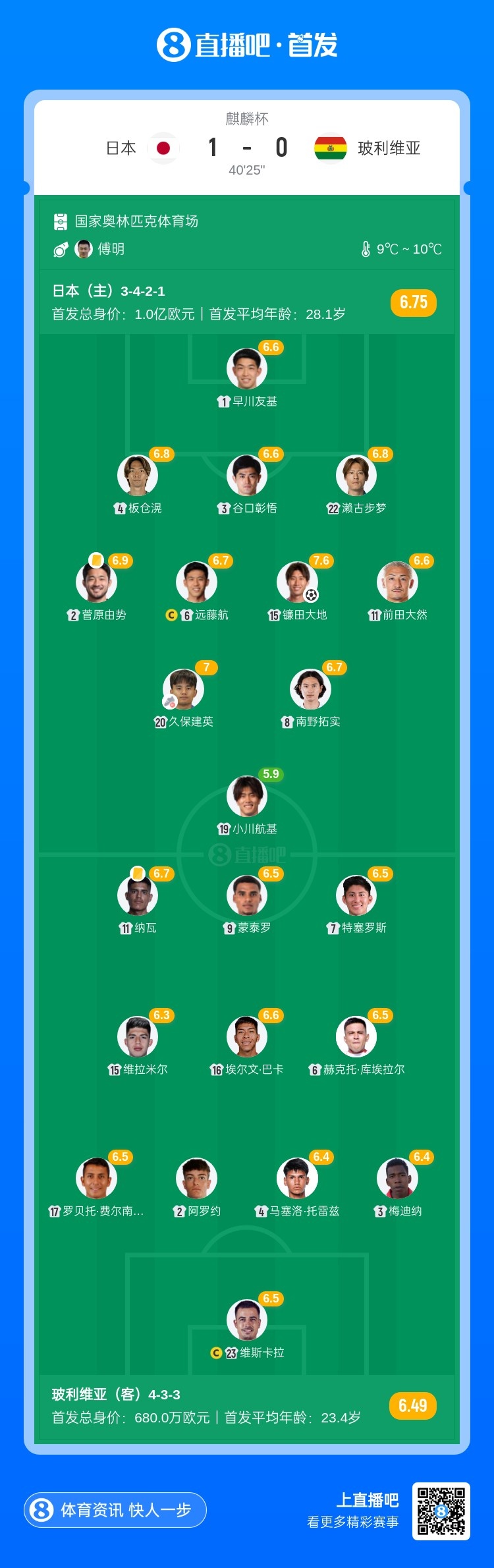 11月18日讯 北京时间18:15,麒麟杯日本vs玻利维亚。下半场,镰田大地抽射破门;菅原由势、纳瓦染黄。半场结束,日本暂时1-0领先玻利维亚。
