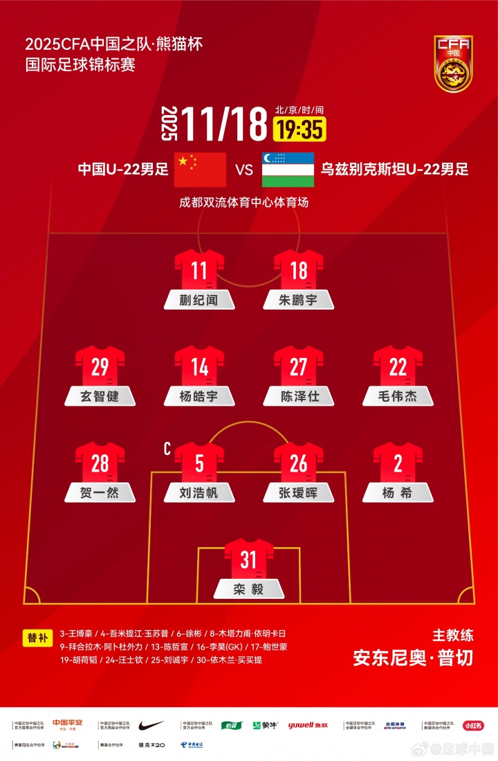 11月18日讯 2025CFA中国之队·熊猫杯国际足球锦标赛第三轮,中国U22男足VS乌兹别克斯坦U22男足官方阵型图如图。