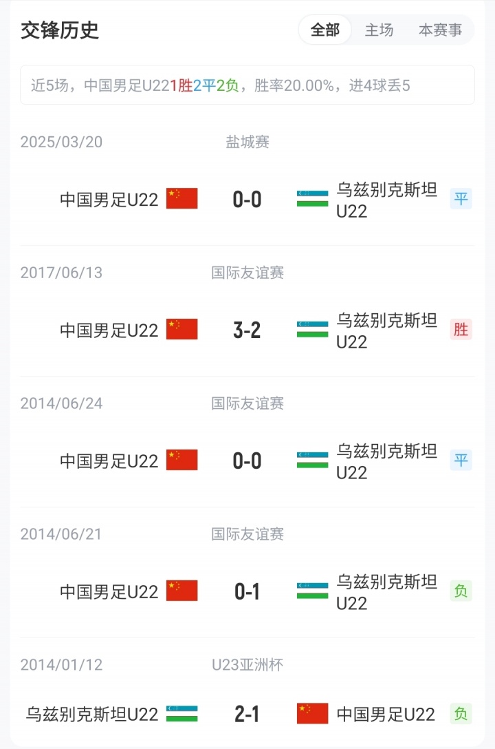 U22国足在首轮比赛中0-1不敌越南U22,次轮2-0击败韩国U22;乌兹别克斯坦U22则是首轮0-2不敌韩国U22,次轮1-0击败越南U22。