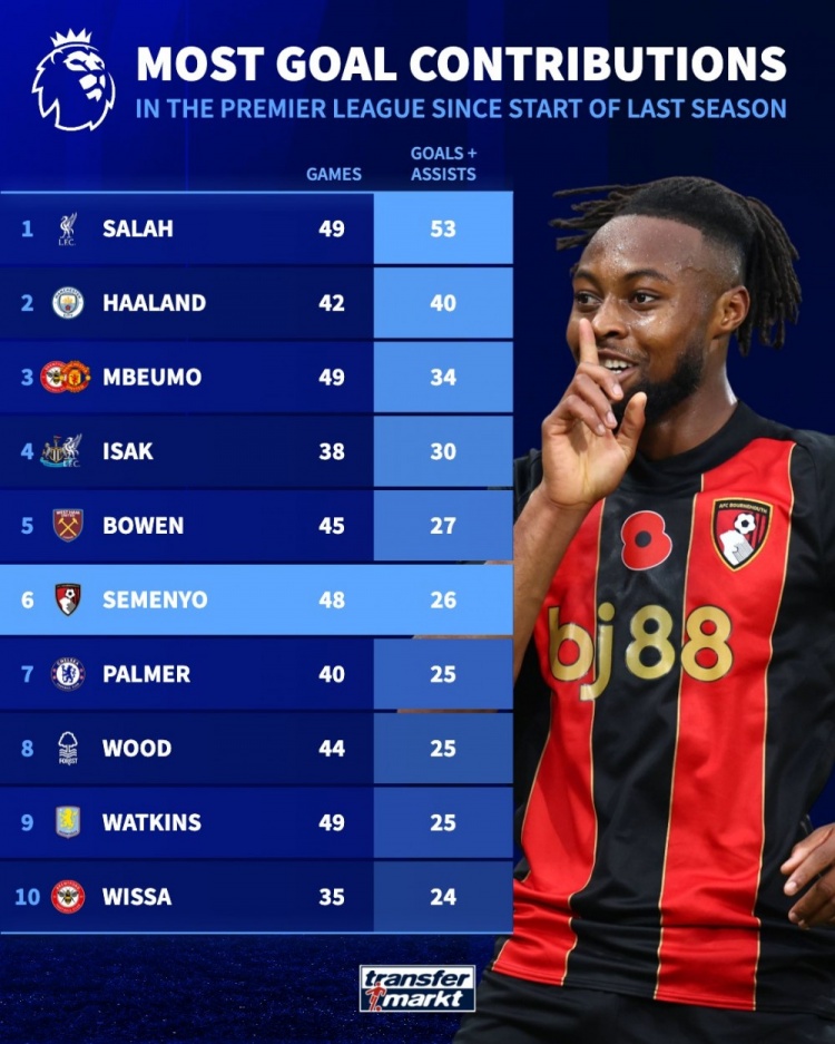 11月18日讯 德国转会市场统计了上赛季至今球员在英超参与进球的数量,并列出榜单,萨拉赫53球居首,哈兰德40球次席,姆伯莫34球第三。