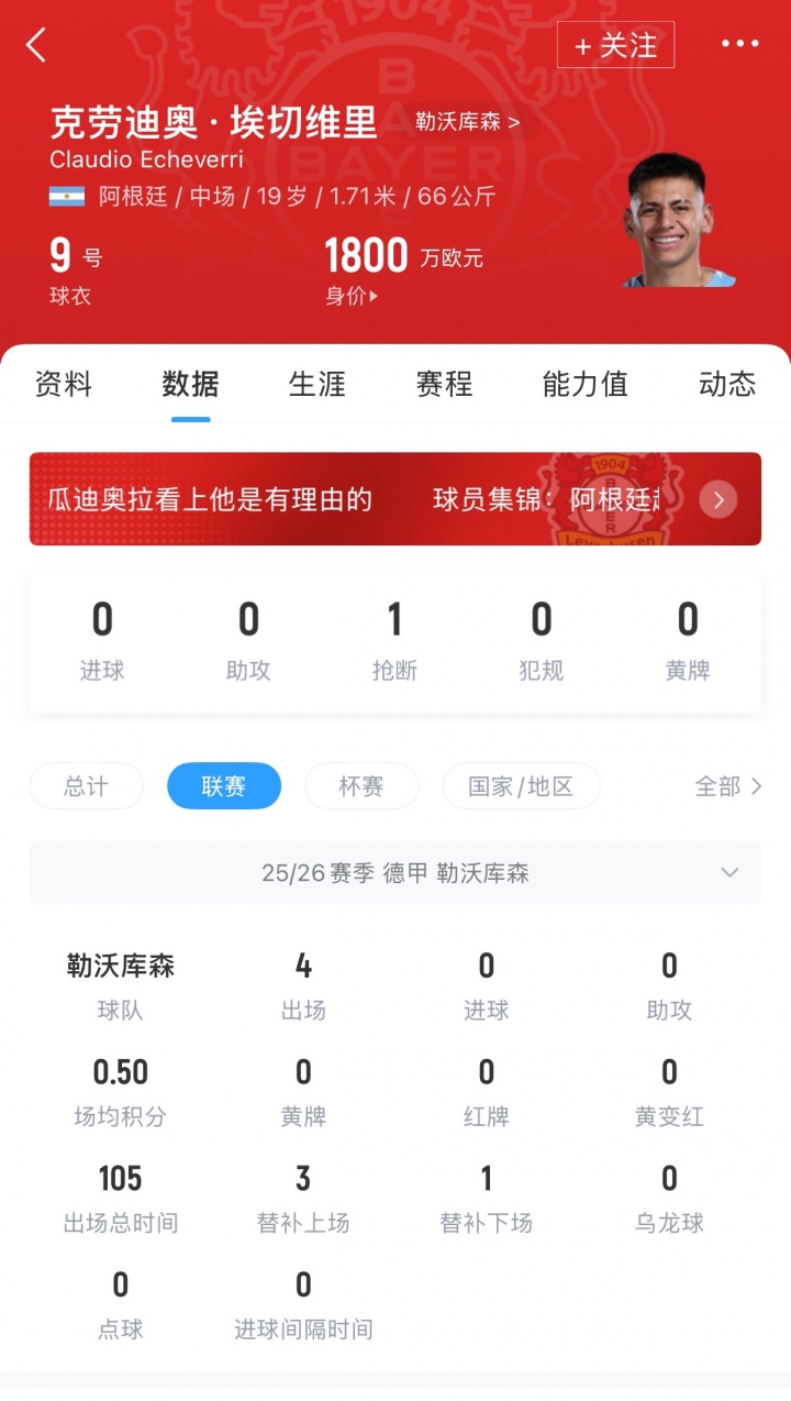 19岁的埃切维里在今夏租借加盟药厂后,联赛仅出场4次,总时间仅105分钟,没有取得进球或者助攻。