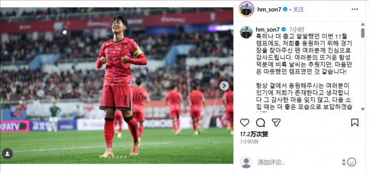 11月20日讯 孙兴慜更新社交媒体,感谢了在本次国家队集训期间来现场加油的韩国球迷。