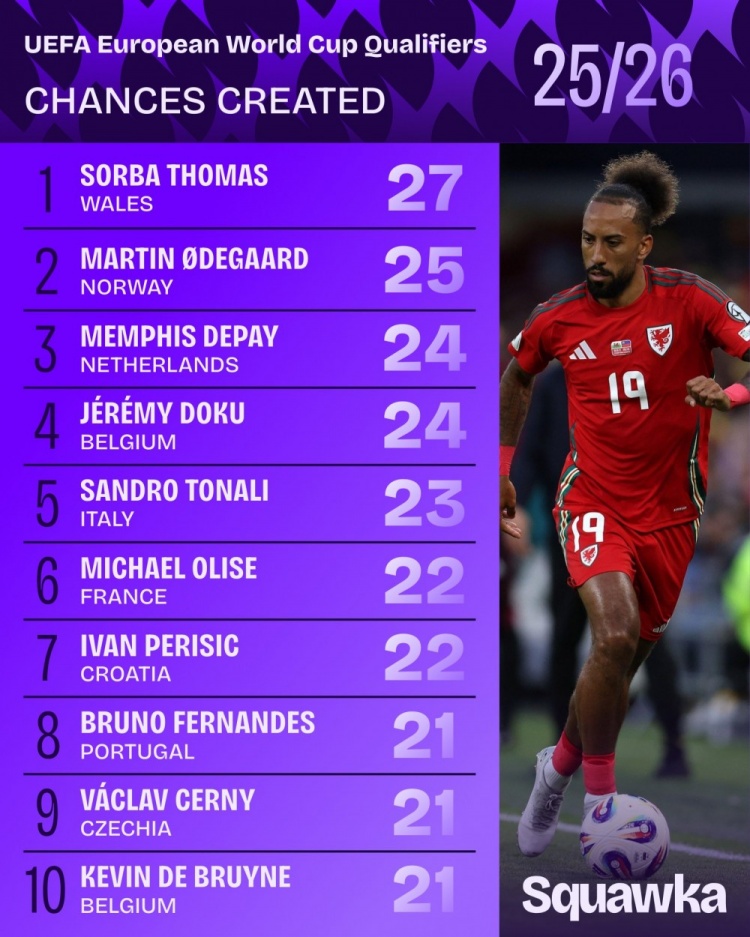11月20日讯 本届世欧预小组赛已经告一段落,squakwa也统计了本届赛事创造机会情况,多位名将在列。