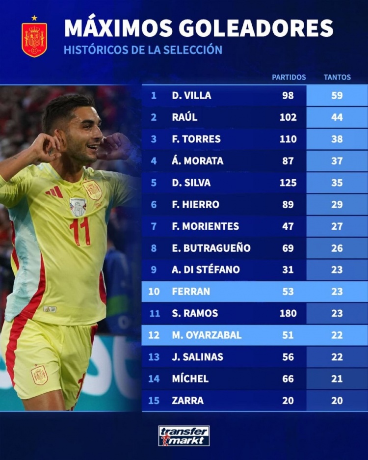 11月20日讯 德国转会市场列出西班牙队史射手榜,比利亚59球居首,费兰-托雷斯23球第10位,奥亚萨瓦尔打进22球。