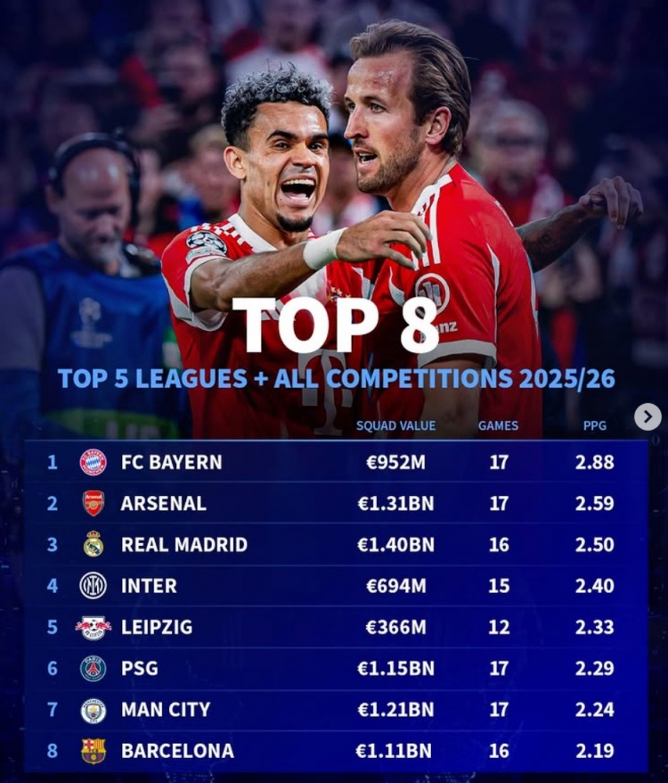 1.拜仁慕尼黑,9.52亿欧元,17场,2.88分