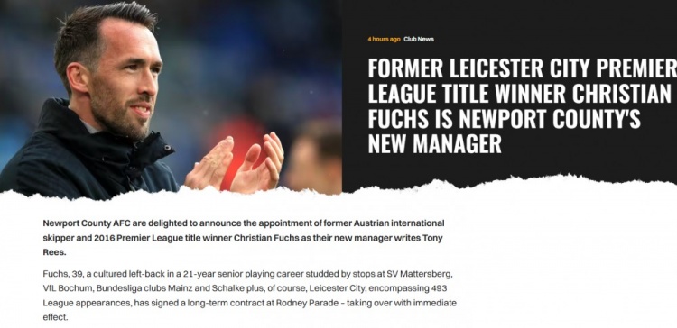 11月21日讯 纽波特郡官方宣布,任命39岁的前莱斯特城英超冠军球员克里斯蒂安·富克斯为新任主教练。