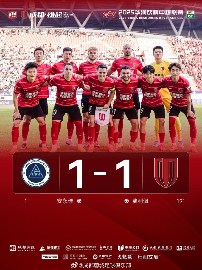 11月22日下午,2025华润饮料中超联赛第30轮,成都蓉城客场挑战深圳新鹏城,迎来本赛季联赛收官战!上半场开场不到1分钟对方打入一球。随后,成都蓉城反客为主,不断在对方门前制造险情。第19分钟,费利佩的强力头槌将比分扳成1-1。下半场易边再战,成都蓉城仍占据上风,可惜未能将机会转化为进球。全场补时第3分钟,对方球员在禁区内出现手臂触球,主裁判第一时间判罚点球,但在观看视频回放后进行改判,点球被取消。最终,成都蓉城1-1战平深圳新鹏城。至此,成都蓉城以17胜9平4负积60分的成绩位列第三名,创成都足球顶级联赛最高积分。