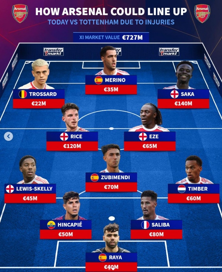 11月23日讯 阿森纳将在本轮英超焦点战对阵热刺,《转会市场》统计显示队内最多可能有8人无法出战。