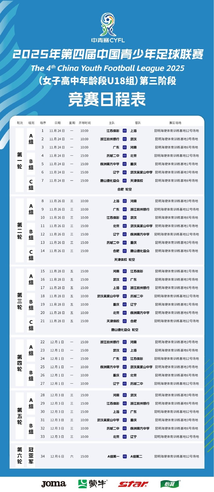 2025年第四届中国青少年足球联赛女子高中年龄段U18组第三阶段将于11月24日至12月6日在云南省昆明海埂高原训练基地举行。