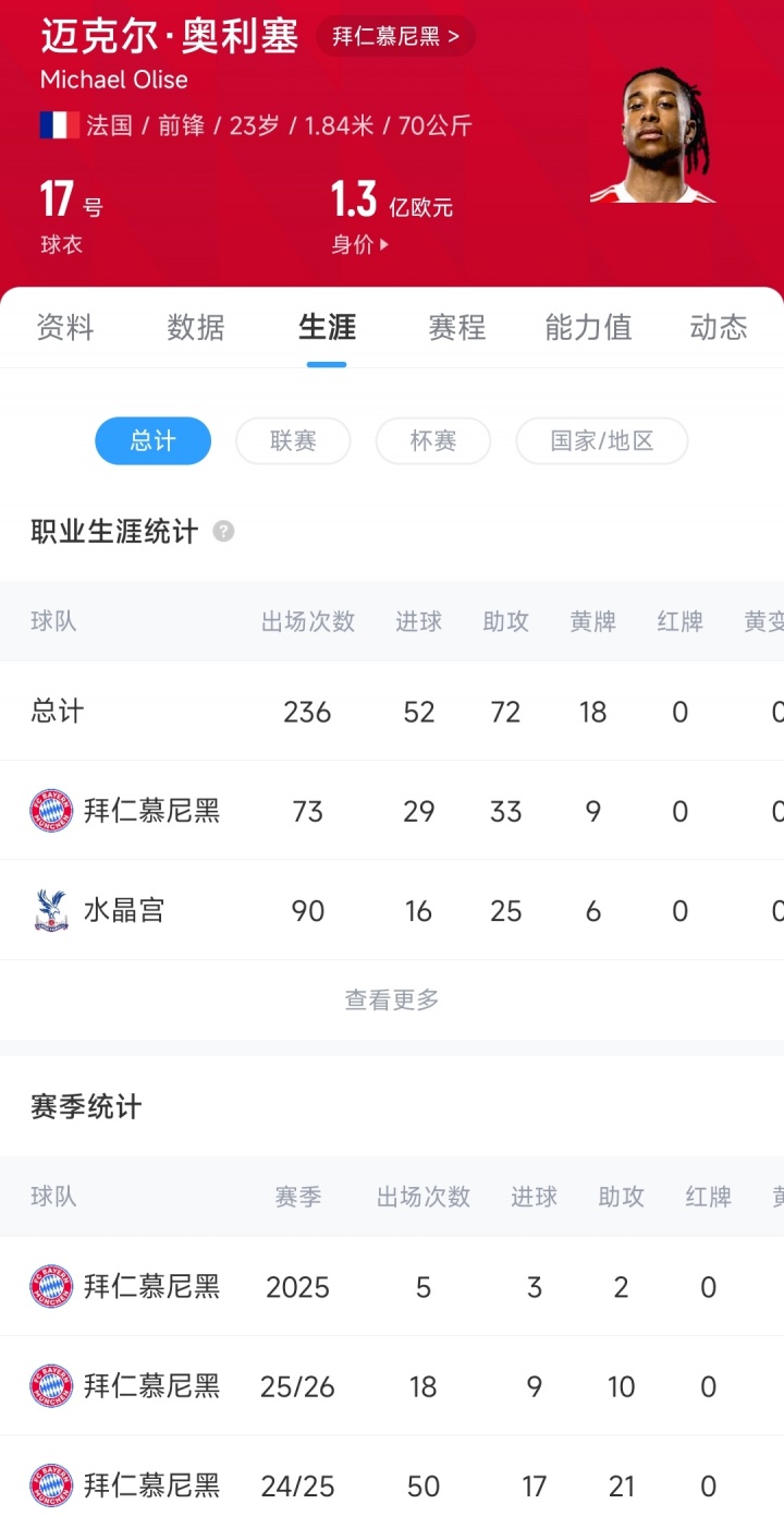 2024年夏窗,奥利塞以5300万欧元的转会费从水晶宫加盟拜仁,至今出战73场比赛29球33助,目前奥利塞的德转身价已经达到了1.3亿欧元,他与拜仁的合同将在2029年到期。