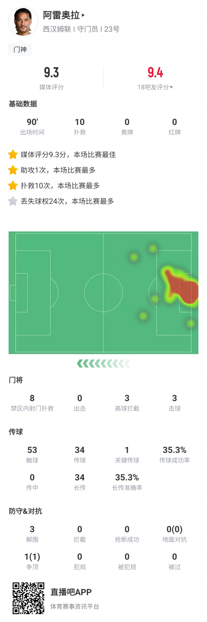 11月23日讯 英超第12轮,伯恩茅斯2-2战平西汉姆联,本场比赛西汉姆联门将阿雷奥拉完成10次扑救,并有1次助攻,媒体评分高达9.3分,帮助球队拿下1分。