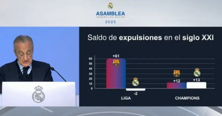 弗洛伦蒂诺:我们必须承认,红牌判罚是主观性最强的环节。不妨看看这些数据:截至2021年,皇家马德里相较对手的净红牌数为-2张,而巴塞罗那则达到61张。然而同一时期在欧冠赛场,两队的净红牌数却几乎持平(巴萨+12,皇马+13)。