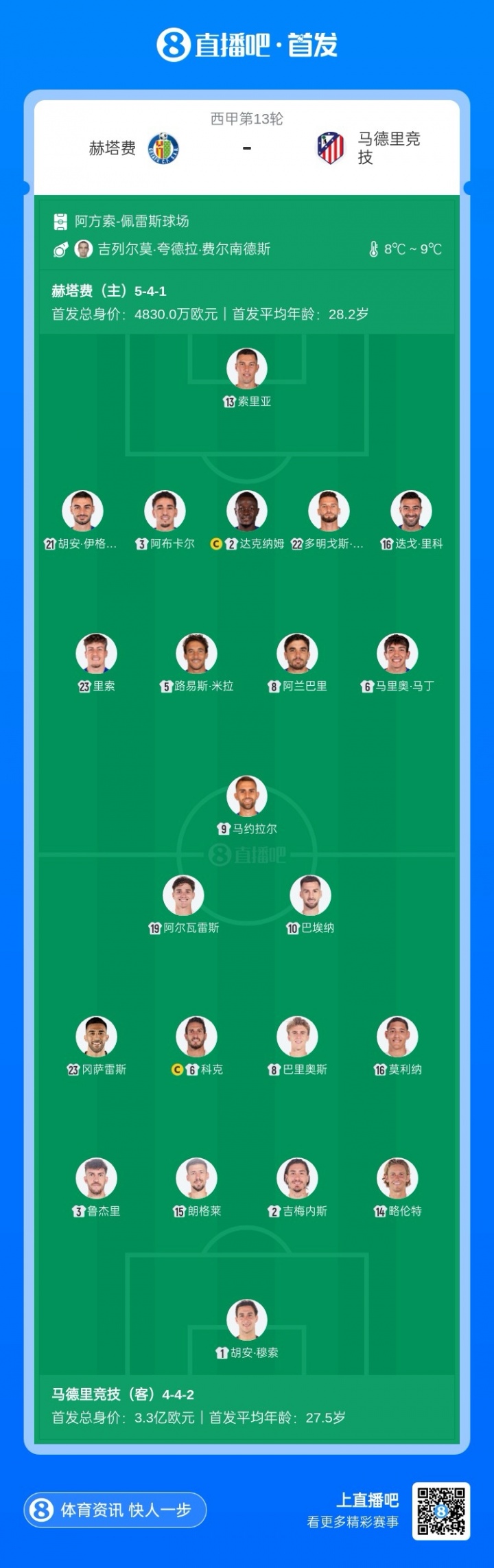 11月24日讯 西甲第13轮,马竞客战赫塔费,赛前首发公布。