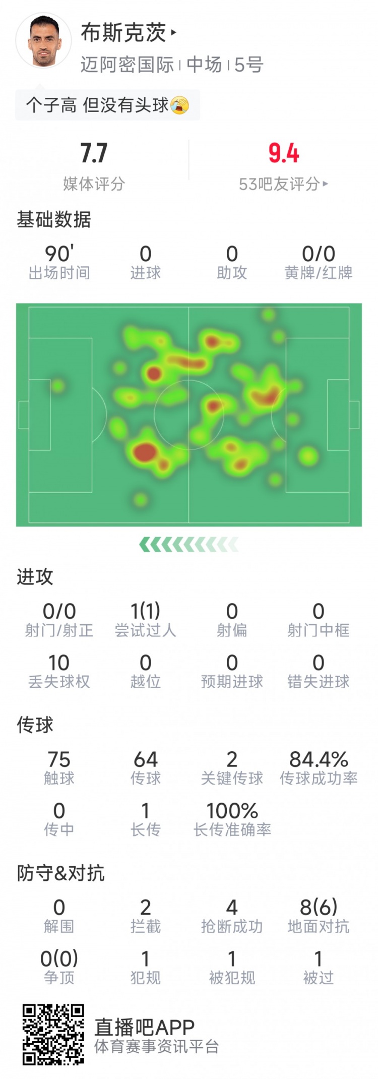 11月24日讯 在美职联1/4决赛,迈阿密国际4-0大胜辛辛那提FC,以下为布斯克茨本场数据:
