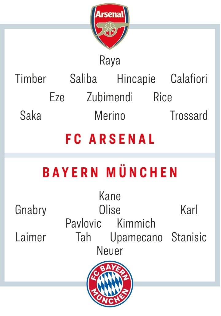 11月24日讯 拜仁和阿森纳在本轮联赛各自取得大胜,两队也将在周中迎来欧冠榜首之争,拜仁作客挑战阿森纳。《踢球者》也预测了双方首发: