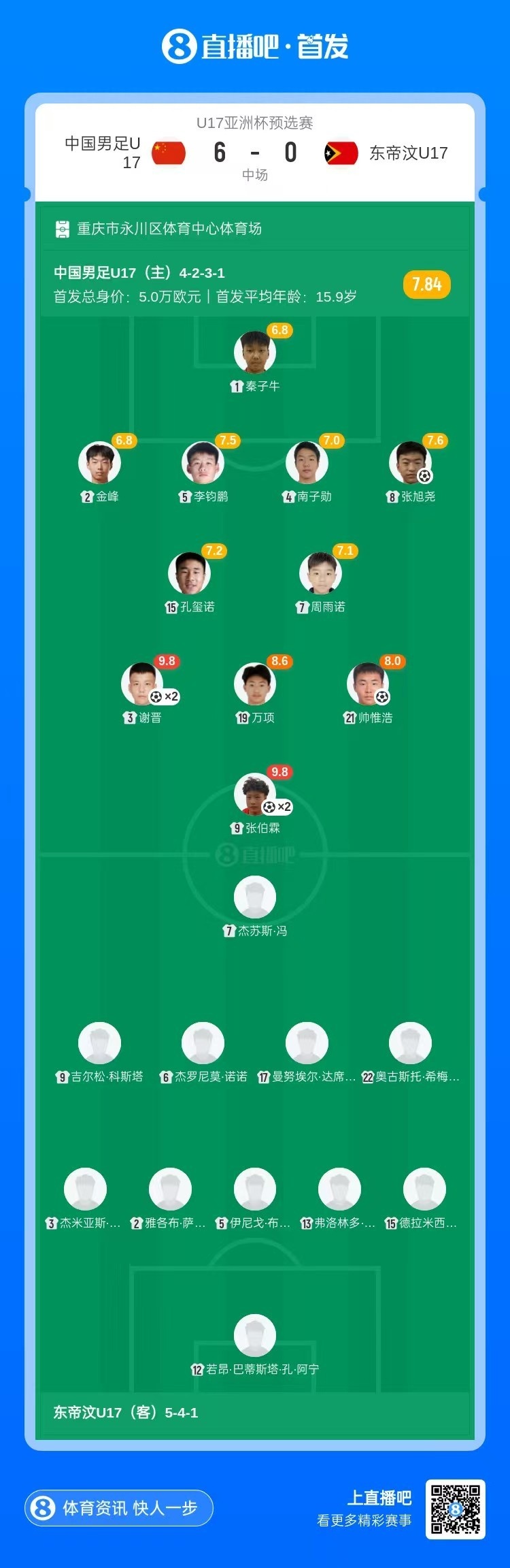 11月24日讯 北京时间19:30,U17亚洲杯预选赛中国男足U16vs东帝汶U16,比赛在重庆市永川区体育中心体育场打响!上半场,万项射门造成门将脱手,张伯霖补射破门;随后万项助攻张旭尧再下一城!张伯霖抓住角球机会,头槌完成梅开二度!张伯霖头球做球,帅惟浩再下一城!半场结束前,又是万项的射门变线,谢晋再进一球同样完成双响!半场结束,U16国足暂6-0领先东帝汶U16。