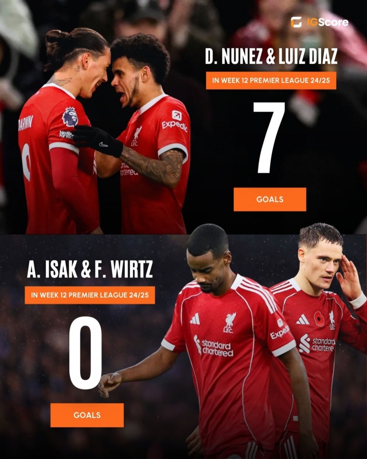 今年夏窗利物浦花费1.45亿欧元+1.25亿欧元签下两大新援伊萨克和维尔茨,但12轮英超过后,两人颗粒未收,只有伊萨克在联赛杯中打进一球。