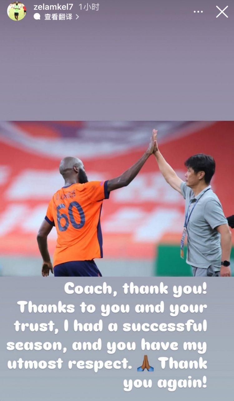 11月24日讯 因声称欠薪而提前离队的海牛外援兰克尔-泽,刚刚更新社媒动态,单独感谢了海牛主帅李霄鹏。