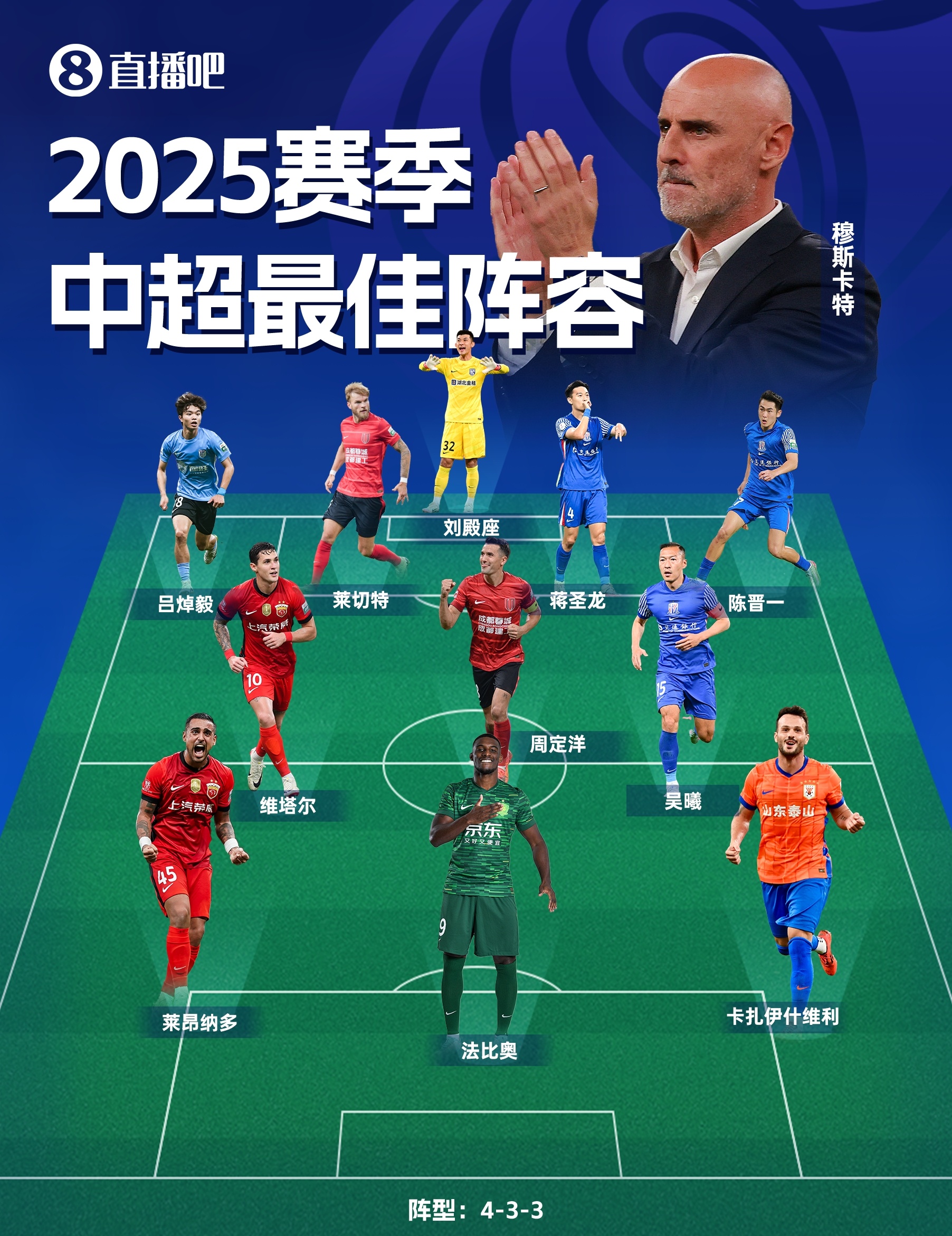 直播吧2025赛季中超最佳阵:法比奥领衔!瓦科在列,穆斯卡特挂帅