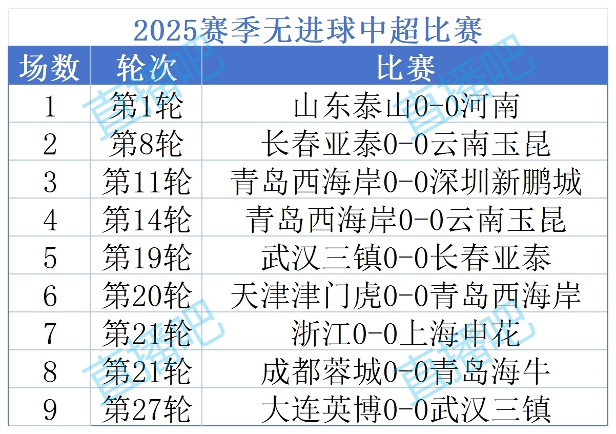 那么有没有没有进球的比赛呢?根据统计本赛季一共有9场比赛没有产生进球,青岛西海岸是0-0场次最多的球队,达到了3场。