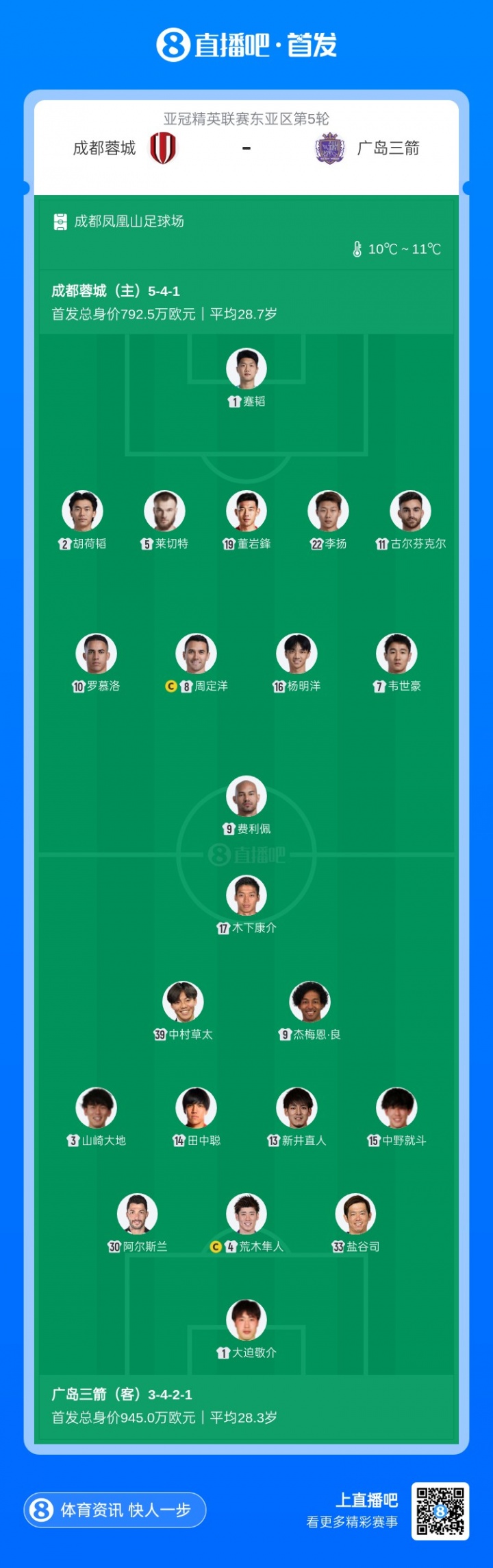 11月25日讯 北京时间20点15分,亚冠精英联赛东亚区第5轮,成都蓉城vs广岛三箭,赛前双方首发公布!