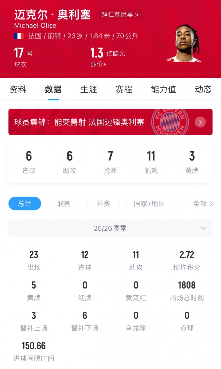奥利塞现年23岁,司职右边锋,他本赛季为拜仁出战23次,贡献12球11助,他与拜仁的合同在2029年到期,现身价1.3亿欧。据悉,奥利塞与拜仁没有解约金条款。