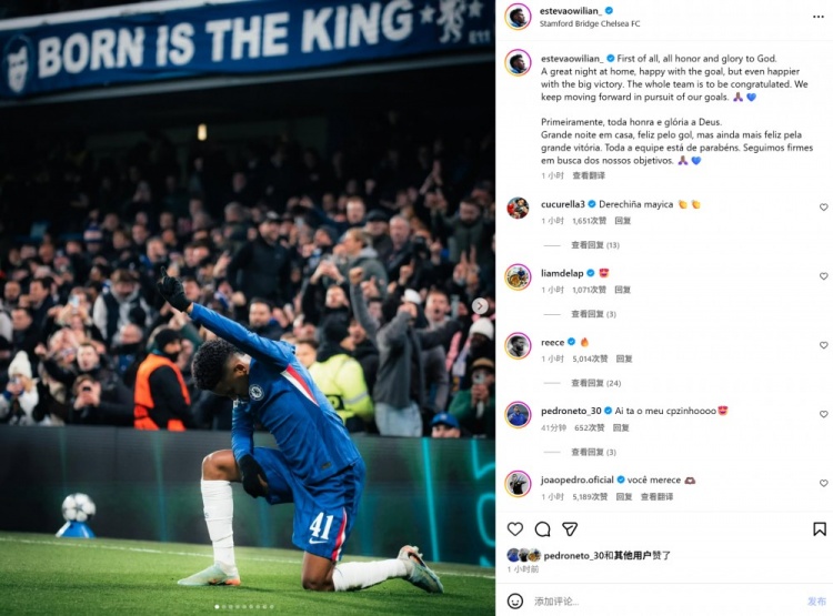 本场比赛埃斯特旺打进精彩进球,赛后他也在社媒晒出庆祝进球照片,配文写道:“首先,一切荣耀归于上帝。在主场度过了一个美好的夜晚,为进球感到高兴,但更为这场大胜感到欣喜。我们整个团队的表现都配得上称赞。我们将继续坚定地追求我们的目标。