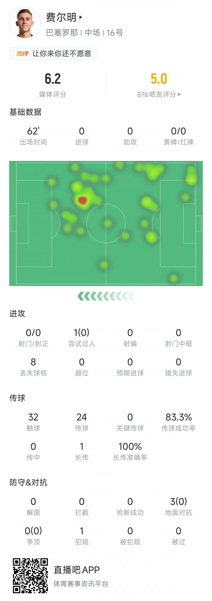 此役费尔明为巴萨首发出战,62分钟时间触球32次,8次丢球权。进攻方面费尔明0射门,0过人,0关键传球,24次传球&成功率83.3%。防守方面他0解围0拦截0抢断0对抗成功。