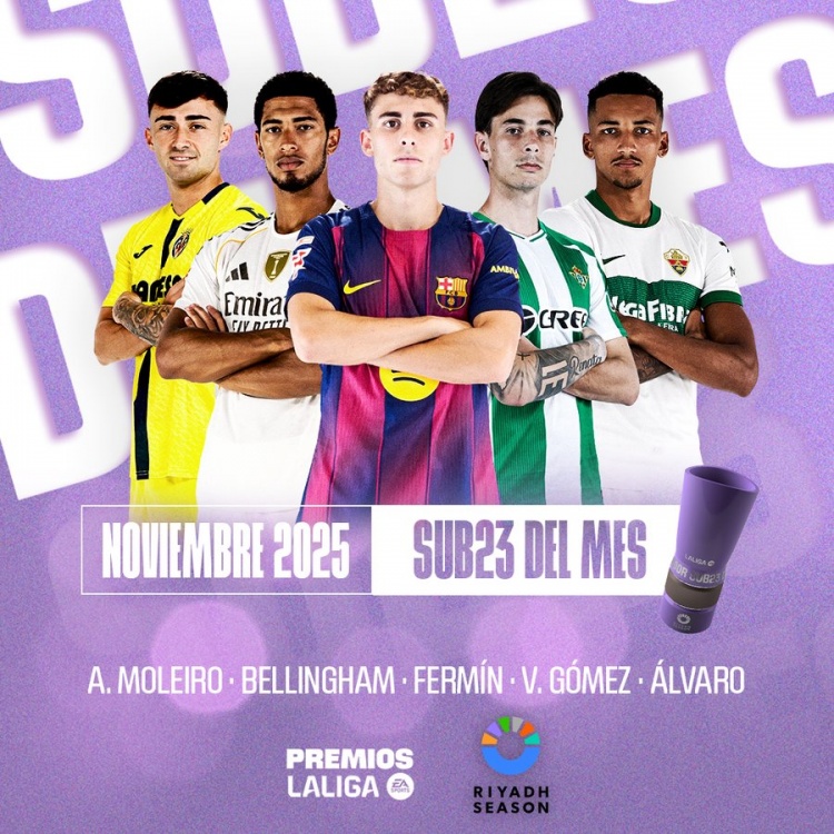 11月27日讯 西甲官方公布联赛11月最佳U23球员候选,费尔明、贝林厄姆在列。