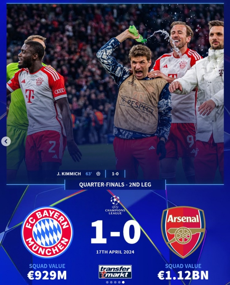 2024年4月八强战次回合:基米希打进制胜球,拜仁1-0阿森纳,总比分3-2晋级