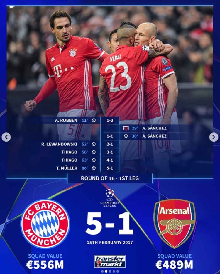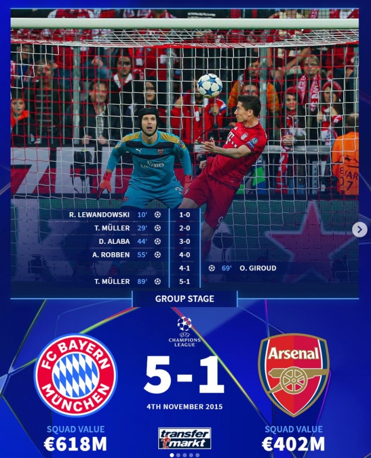 2015年11月小组赛:莱万、穆勒、阿拉巴、罗本先后建功,吉鲁为客队挽回掩面,穆勒最后时刻再入一球,这也是拜仁首次5-1击败阿森纳。