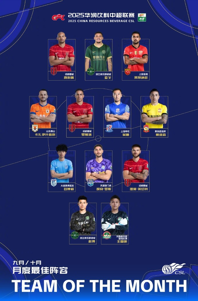 中超9/10月最佳阵容:瓦科、吕焯毅在列,两门将入选,蓉城三人