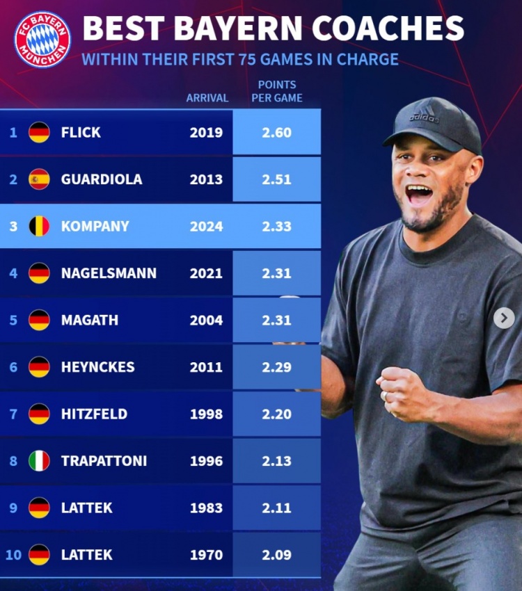 拜仁主帅前75场场均拿分榜:弗里克压瓜帅居首 孔帕尼2.33分列第3