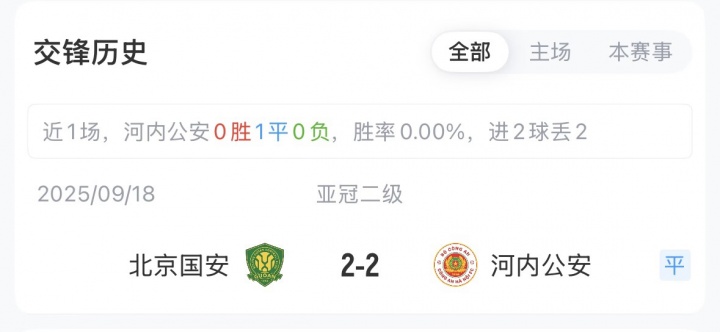 亚冠二级E组前四轮,北京国安1胜2平1负积5分,排名第3,河内公安1胜2平1负积5分,排名第2。