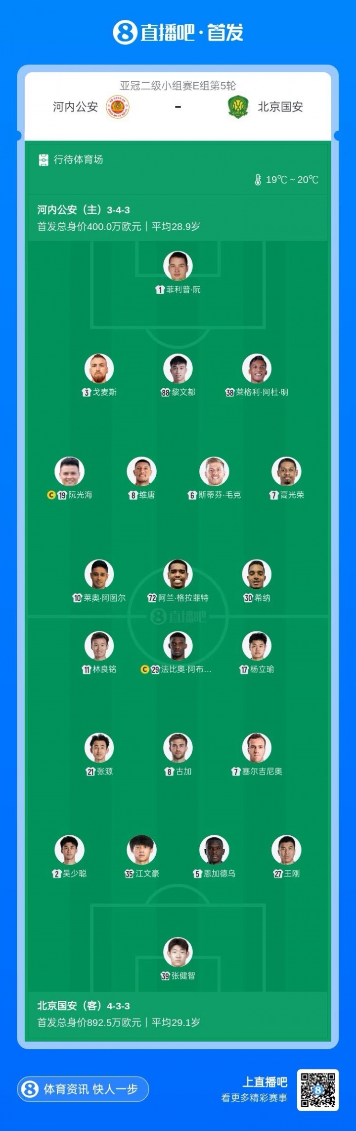 11月27日讯 北京时间今晚20:15,亚冠二级小组赛第5轮,北京国安客场挑战河内公安。赛前,双方首发出炉。