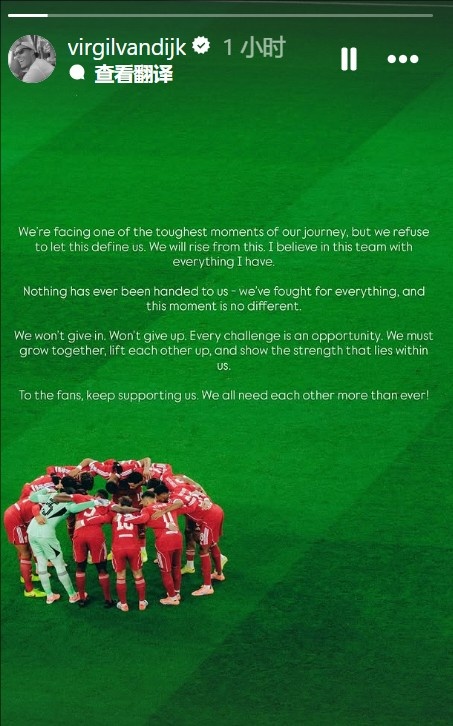 范戴克写道:我们正面临旅程中最艰难的时刻之一,但我们拒绝让这一切定义我们。我们将从中崛起。我全心全意相信这支球队。