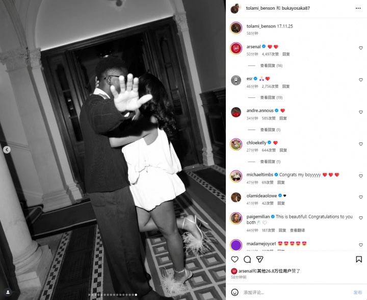 这则帖子也得到了萨利巴、加布里埃尔、埃泽等队友以及阿森纳官方的评论祝贺。