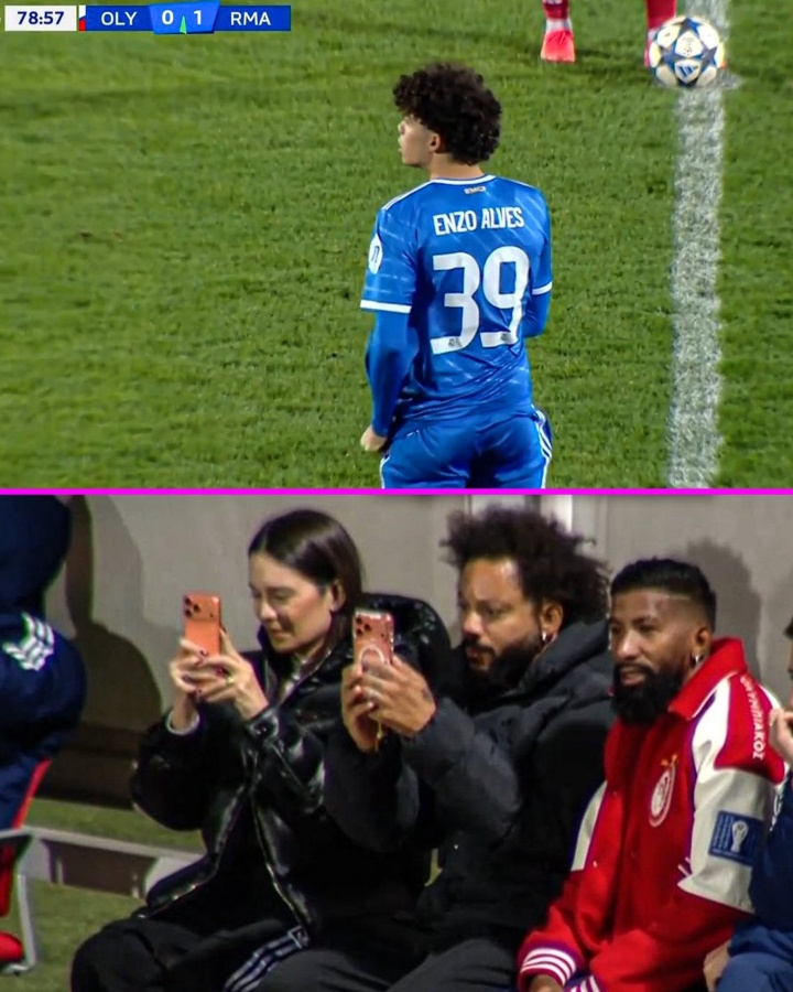16岁的恩佐·阿尔维斯在第79分钟替补登场,镜头给到场边的父亲马塞洛,后者正在用手机拍下儿子首秀的瞬间。