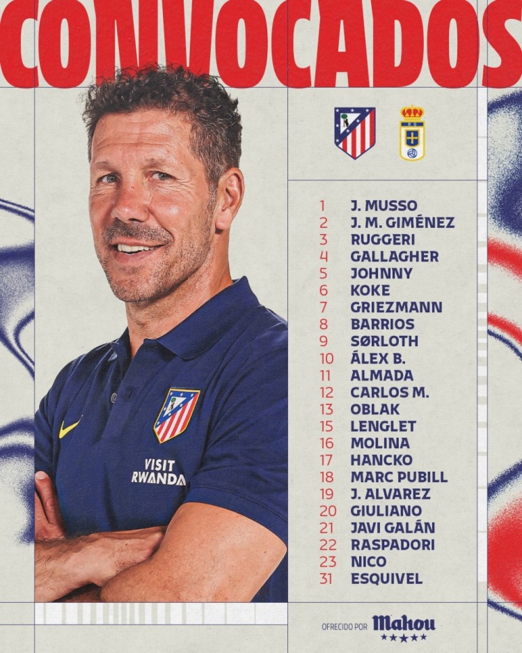 前锋:7-格列兹曼、9-瑟尔洛特、11-阿尔马达、19-阿尔瓦雷斯、20-朱利亚诺-西蒙尼、22-拉斯帕多里、23-冈萨雷斯