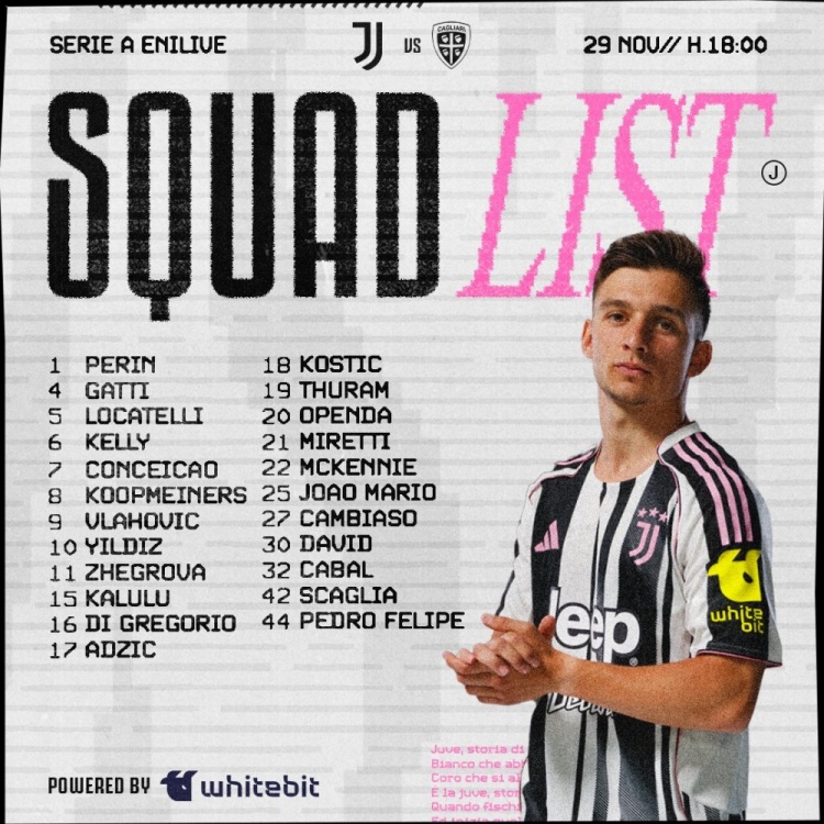 11月29日讯 北京时间明天凌晨1点,尤文将在意甲第13轮比赛中主场对阵卡利亚里,尤文公布了此役的球员名单。