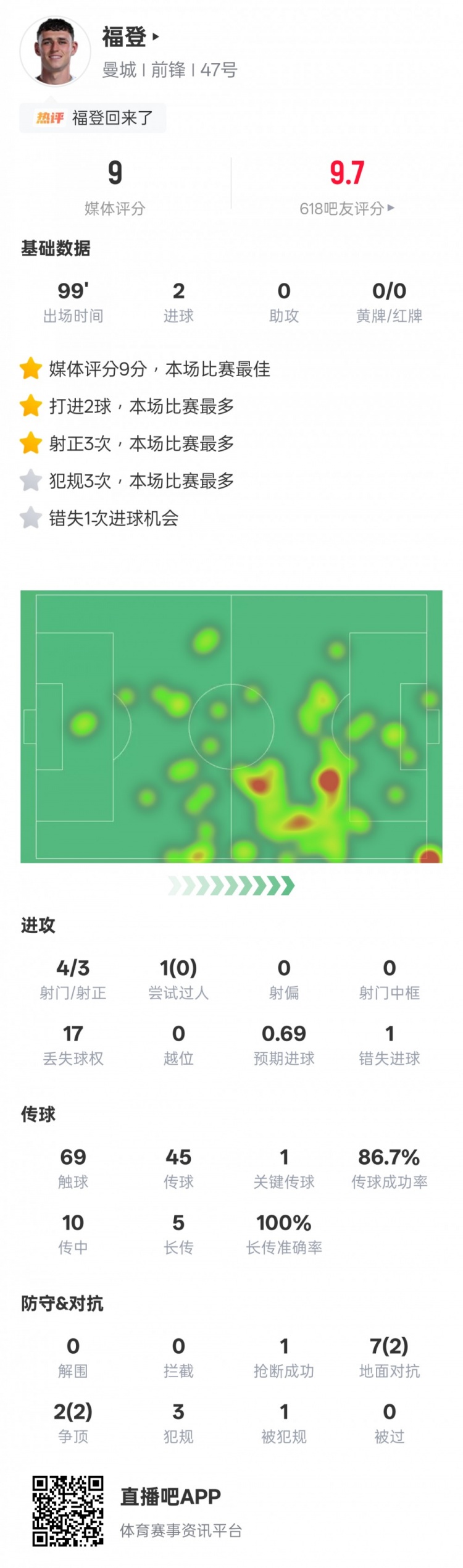 11月30日讯 英超第13轮,曼城3-2利兹联。福登首发出战,贡献双响,送出1次关键传球,但也错失1次进球机会,评分9.0全场最高。
