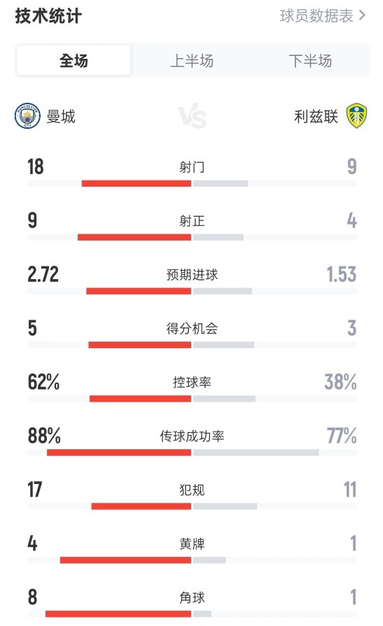 11月30日讯 英超第13轮,曼城3-2战胜利兹联。