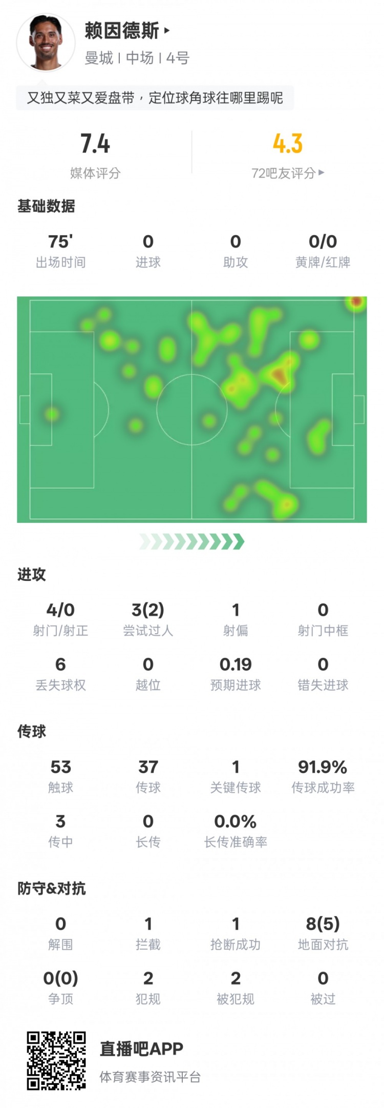 11月30日讯 英超第13轮,曼城主场迎战利兹联。赖因德斯首发出战,2次过人成功,送出1次关键传球,传球成功率91.9%,评分7.4。