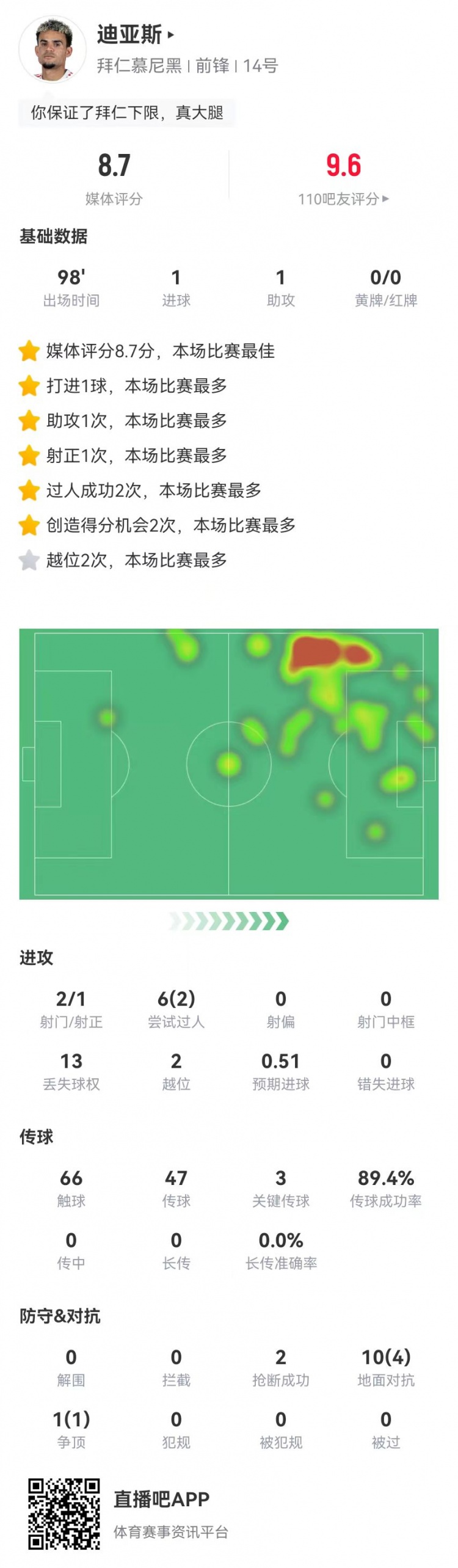 11月30日讯 拜仁在本轮德甲3-1逆转圣保利,迪亚斯本场数据如下: