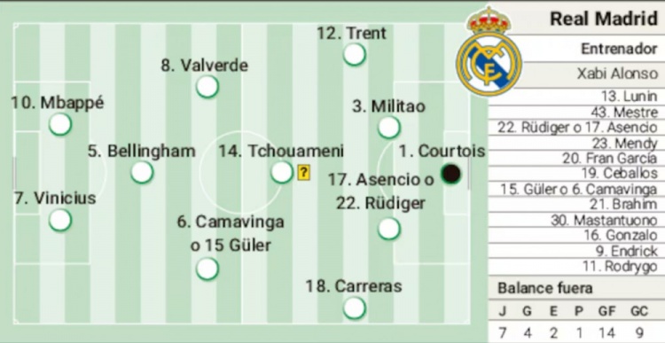 阿斯预测皇马首发:锋线维尼修斯、姆巴佩,库尔图瓦贝林厄姆出战
